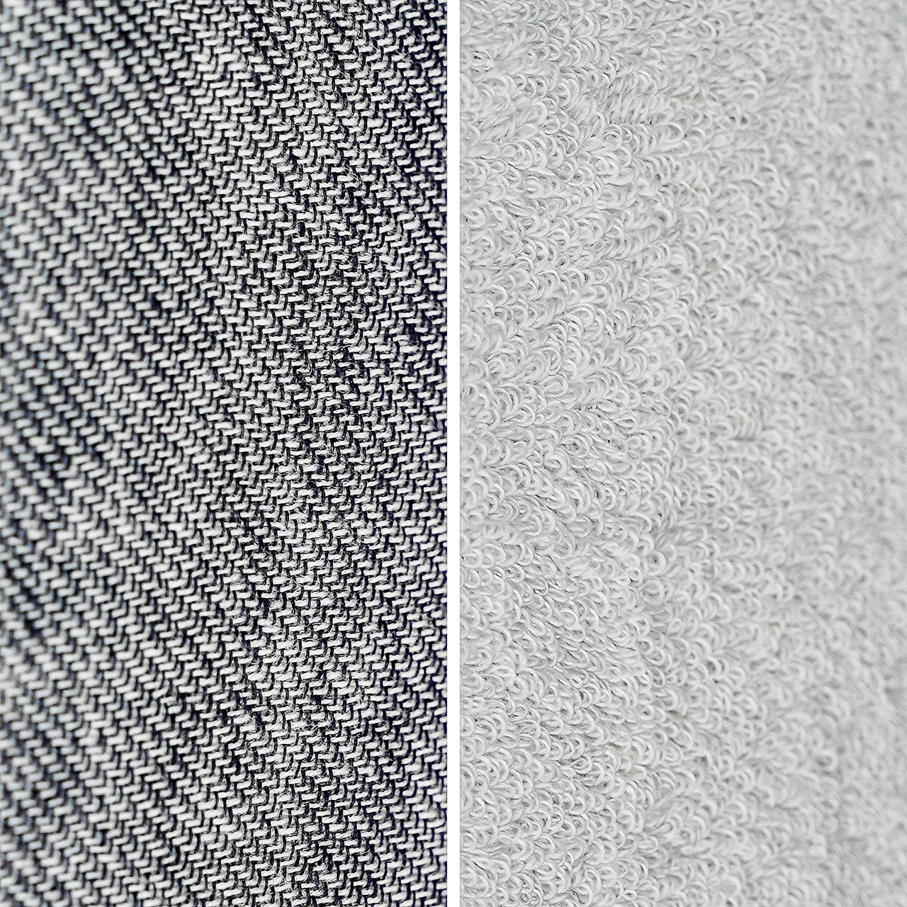 The front features a denim-like gauze weave, while the back is a soft pile fabric for superior absorbency.